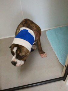 Guppy with a “granny wrap” bandage to keep his ears safe and secure (and my walls blood free). |