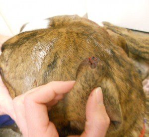 Now another conundrum presented itself. “If I bring Guppy into the clinic to work on him by myself he is going to bleed everywhere,” I reasoned. “But when I let go of his ear, it is going to bleed again.” In all actuality, Guppy’s wound–while messy–was not life threatening. I had time to go into the clinic and collect some supplies.