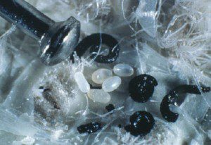 Flea eggs and flea dirt (poop) in carpet beside the head of a pin. |