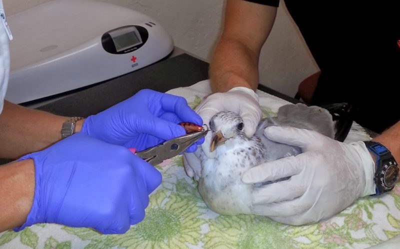 | Removing fishing lure hooks from the gull’s nares (nostril). |